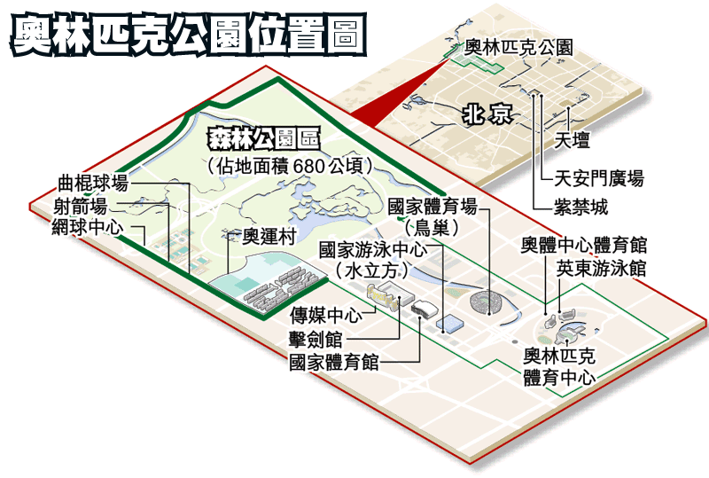 「這是北京一個大景點,造型與鳥巢等場館非常匹配,可說是天人合一。將來遊客到北京,必到這裏,不來是遺憾。」家住北京的通訊從業員王先生對公園的印象評分,比政府宣傳用語,更加專業誇張。公園是否必到景點,見仁見智,遺憾的應是當局沒有大力宣傳,國際傳媒雲集的新聞中心沒有森林公園的刊物單張,現場所見的外國遊人也極度稀少。全園最大亮點應是大約百米高的仰山山頂「天境」,那裏可以環顧四周北京市容。當中面向鳥巢的觀景台,更是遊客舉起相機喪拍的熱點。美國泳隊選手DrewEdwards昨日也來觀光,他說阿特蘭大的奧林匹克公園沒有高點,不會看見那麼宏偉的建築群。