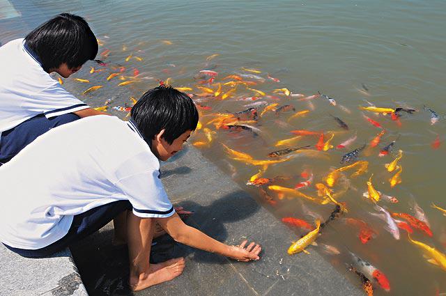 進門不久,便是名為奧海的一片小湖。那裏有數百尾錦鯉邀人逗玩,很多小孩在梯級形的湖岸,伸手與錦鯉零距離接觸。魚兒相當好客,無非為了遊人的魚糧,有遊客帶備了麵包餵飼牠們,也有小孩胡亂餵飼垃圾零食。