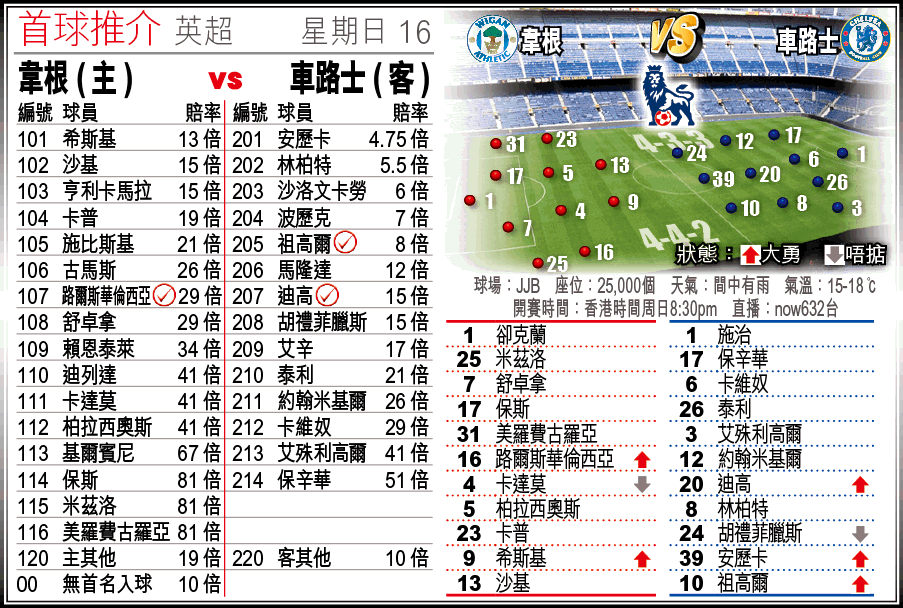 車路士在季初順到不得了,身為賭仔豈會放過追紅盤的機會?周日英超早場在JJB球場恭候「藍戰士」的韋根,剛有8名國腳於上周中國際賽出戰,領隊布魯士坦言影響排陣;反觀車路士兵源足,直取2.15倍「客勝」。(球賽編號:星期日16;now632台今日8:30pm直播)畢傑