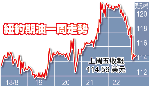 期油上周五最低見114.18美元,較周四跌7美元,收市略為收窄至114.59美元,跌6.59美元,雖然盤中跌幅不及上月15日的9.26美元大,但收市計則高於當日的6.44美元;跌幅5.44%也比當日的4.44%為大。
