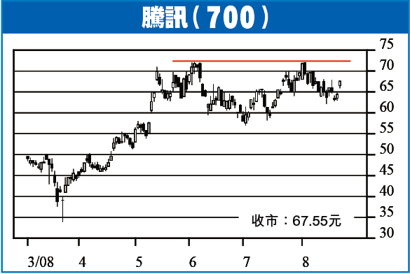 然技術走勢好,作為恒指成份股的騰訊,料會成為好友推高港股的工具之一,短線料可上試73元,破位向80元推進。