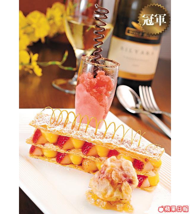 先以麥酥做底,中間放入吉士忌廉、甜酒及士多啤梨,面頭再加焦點圈作裝飾。另外再有先用酒浸過的士多啤梨天婦羅,及蜜糖塊墊底。麥酥入口脆心,連吉士忌廉和士多啤梨食感覺更滑,天婦羅內腍外脆,感覺十分特別。