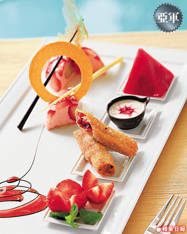 師傅先將士多啤梨切片雪凍再攪爛,混入椰奶煮溶加入忌廉和士多啤梨,再加餅底墊底放入冰櫃一個鐘。椰子香味撲鼻,入口香滑,配士多啤梨味道很夾,奶凍凍食非常清爽;甜味春卷亦相當吸引,改用果仁、吉士忌廉和士多啤梨作餡料,用春卷皮捲好再炸。士多啤梨肉依然沒有變腍,入口感覺春卷皮脆而餡料甜蜜,感覺非常特別。