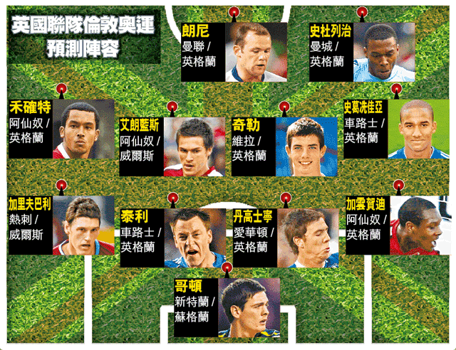 2012年的英國聯隊仍有不少星級戰將壓陣,像熱刺的威爾斯大國腳加里夫巴利,屆時年僅23歲,將是防線重要一員。其餘位置料多由阿仙奴小將壟斷,尤其禾確特、蘭斯貝利及艾朗藍斯等俱是年輕具潛質球員,維拉中場奇勒則甚具領軍潛質。
