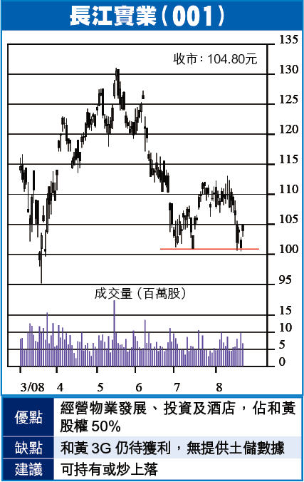 當然,樓市的變動,將左右長實前景,至於和黃的貢獻,預期3G業務至2010年或以後才有真正純利,因而以PE衡量股價並不實際,可以參考的,是6月底每股資產淨值100.30元(包括應佔和黃66.92元及長實33.38元),這是賬面值,與實際應有若干差異。