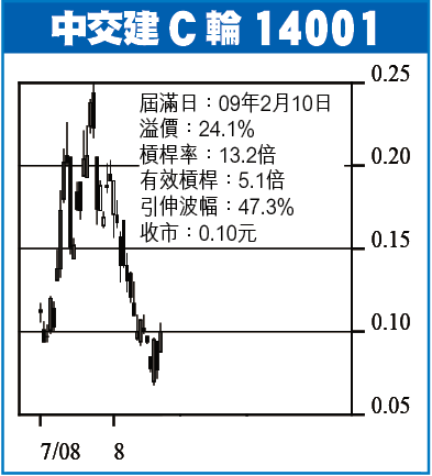 中交建C輪14001:中交建(1800)昨收13.20元,升4.7巴仙,下一站睇14.20元,可以諗吓隻C輪14001,昨收10仙,槓桿13.2倍(有效槓桿5.1倍),正股升上14.20元,14001可見14.3仙樓上,正股跌穿12.60元就沽咗隻輪止蝕。