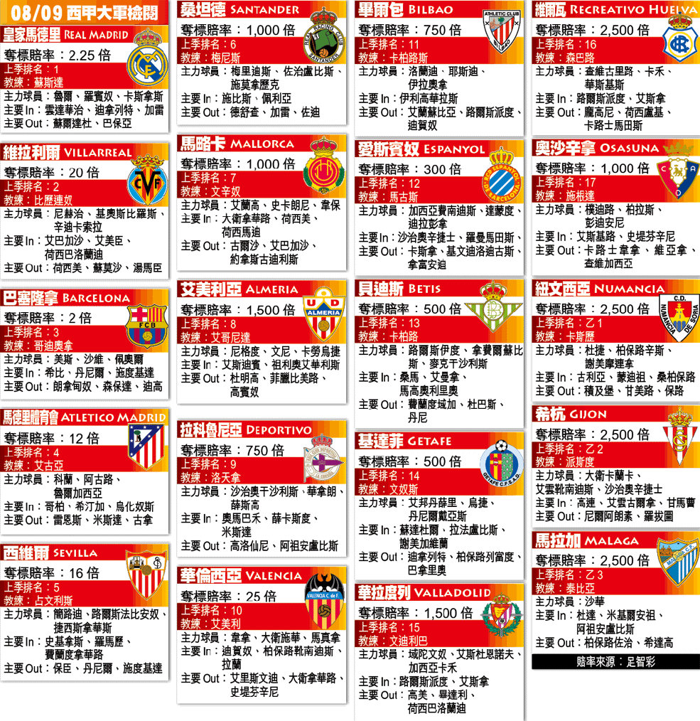 皇馬教練蘇斯達去季上任後,除即時奪得西甲錦標外,亦開始將球隊「荷蘭化」;雲尼斯達萊、洛賓、史奈達、雲達華治及德倫特俱是荷蘭兵,配合魯爾、加高及沙治奧拉莫斯等原有陣容,默契上肯定較各隊優勝。唯一令人擔心的是,羅賓奴醞釀離隊多時,假若轉投車路士必影響皇馬左右路側擊力;如留隊的話,羅賓奴的鬥心成疑外,隊友間亦料出現不和事件。