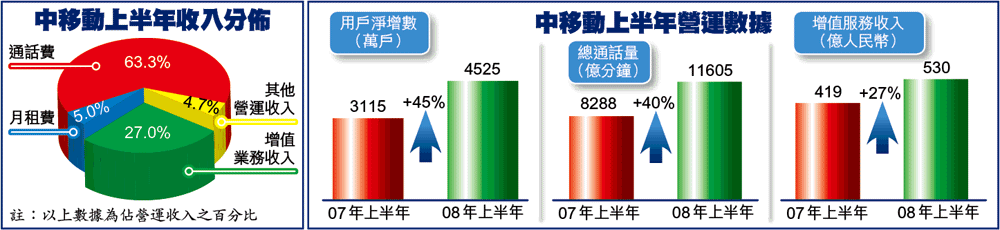 中移動的「藍海戰略」繼續得以發揮,透過拓展農村市場「低ARPU(每月每戶平均收入)、低MOU(平均每月每戶通話分鐘)、低成本」策略,上半年新增客戶4525萬戶,平均每月淨增長750萬戶,累計總用戶人數達4.1億戶。
