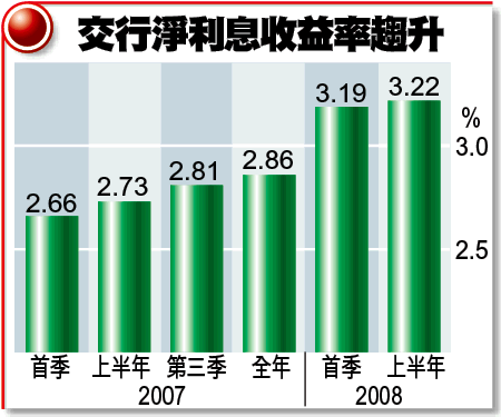 交行上半年淨利息收益率較去年底擴闊36點子至3.22%,淨利息及淨手續費佣金收益分別增長40.6%及50%。蔣超良表示,該行淨利息收益率水平已「到頂」,隨着負債成本上升,未來息差很難再擴大;兩稅合一令該行所得稅率降至25%,亦屬一次性因素,故他相信中期盈利增幅已見頂。