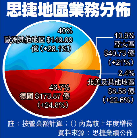 按營業額計算,德國仍是思捷最主要市場,單是該市場便佔總營業額46.7%,營業額增長24.8%;除德國以外的其他歐洲市場佔40%,增長28.1%。至於以往表現並不突出的亞太區市場則佔11%,錄得21%增長。全年同店營業額增幅放慢至7%。思捷首半年同店營業額增幅為8%。