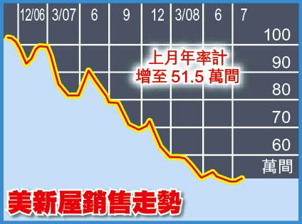 美國7月份新屋銷售升2.4%,以年率計增至51.5萬間,較預期少;售價中位數按年急跌6.3%至23.07萬美元(約180萬港元)。6月份銷量由原先統計的53萬間向下修訂至50.3萬間,市場分析指,樓價下跌令更多市民能夠應付樓宇按揭,有助加快出售存貨。至於反映全美20大城市樓價的標普/Case-Shiller指數,6月份按年跌15.9%,跌幅少於分析預期的16.2%,意味樓市有望回穩。