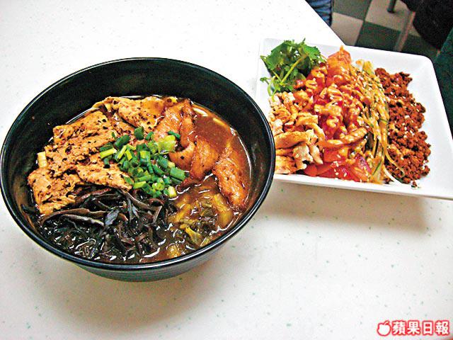 (右)雞絲炸醬凉拌米線,進食時把芫荽、青瓜絲、番茄、芝麻、麻醬混合起來,味道清爽開胃,$30;腩肉豬頸肉黑木耳小鍋米線,豬頸肉即叫即炸$32。