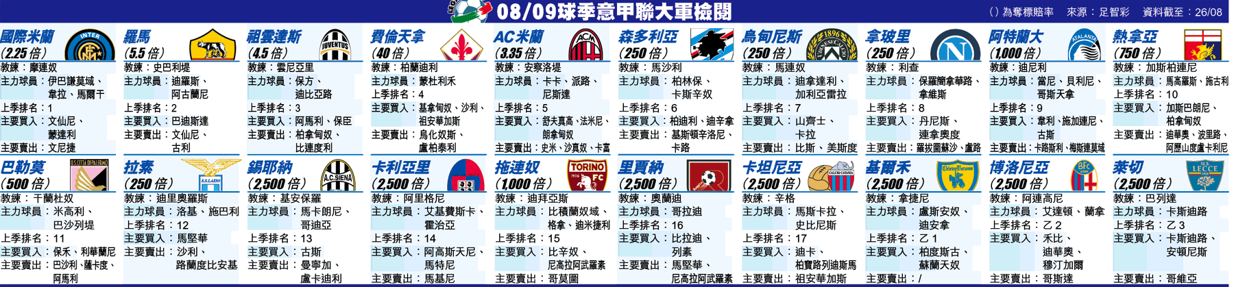 意甲已正式進入5雄爭霸的時代,米蘭雙雄、祖雲達斯、羅馬和費倫天拿,已拋離其他球隊。其中AC米蘭以豪華陣容應付聯賽和歐協盃,可謂是殺雞用牛刀,相信可以輕輕鬆鬆參與意甲競逐;最大對手則是同市的國際米蘭,以摩連奴的實力和完善的陣容,將成為AC米蘭的最大勁敵。