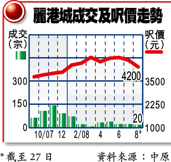 市場氣氛審慎,整體成交持續減少,去年11月旺市時,麗港城成交量多達近150宗,隨着市況回軟,輾轉回落逾80%,至上月僅25宗,本月暫時也只得20宗。由於業主心態開始軟化,大部份都肯減價,屋苑現有逾600個放盤中,平均每呎叫價4300元,較高位回落10至15%。