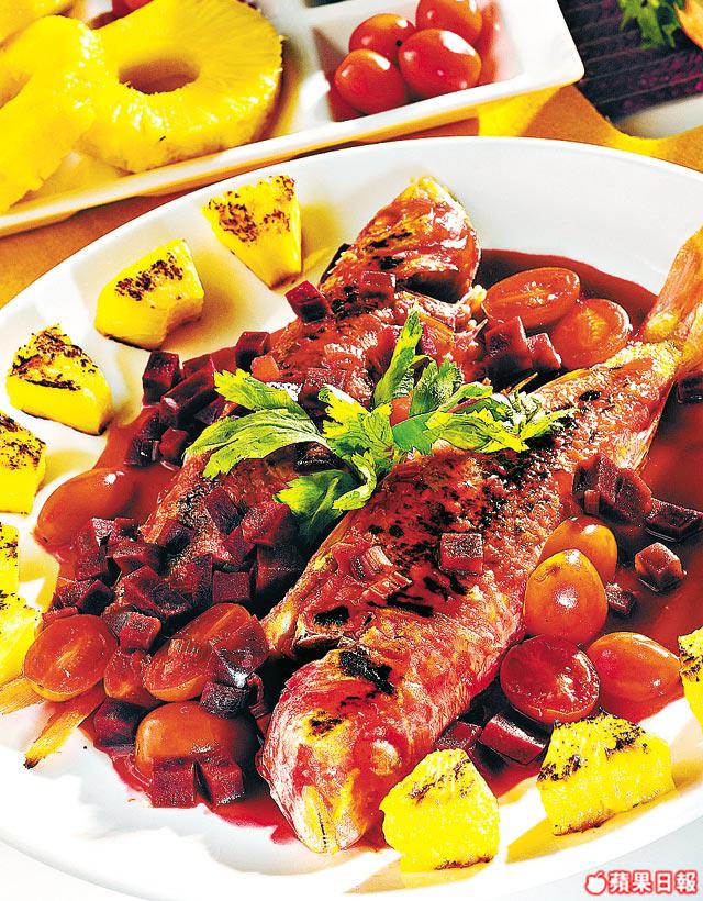 紅衫魚2條、紅菜頭1個、車厘茄12粒、薑2片、唐芹2條、水11/2杯、橄欖油2茶匙、菠蘿粒/鹽/粟粉各少許、薑茸1茶匙、生粉水少許