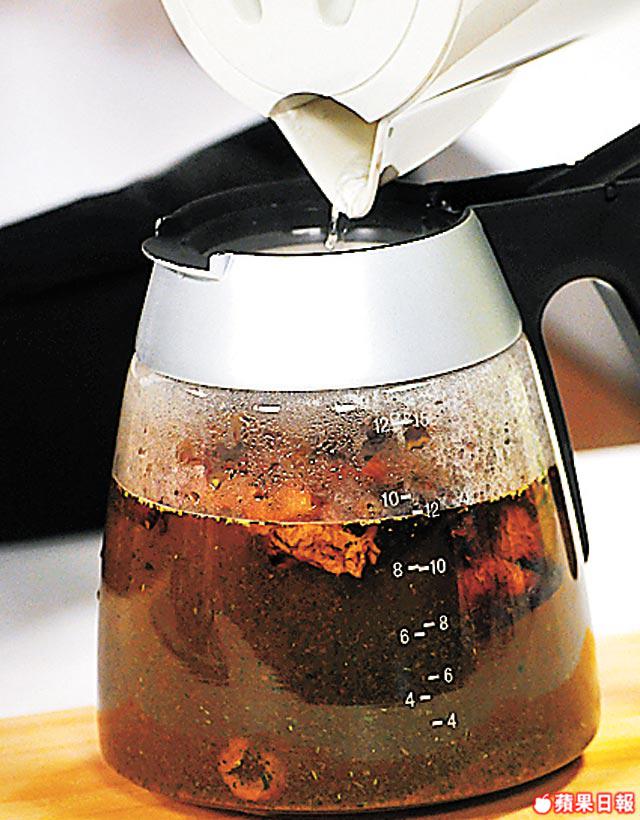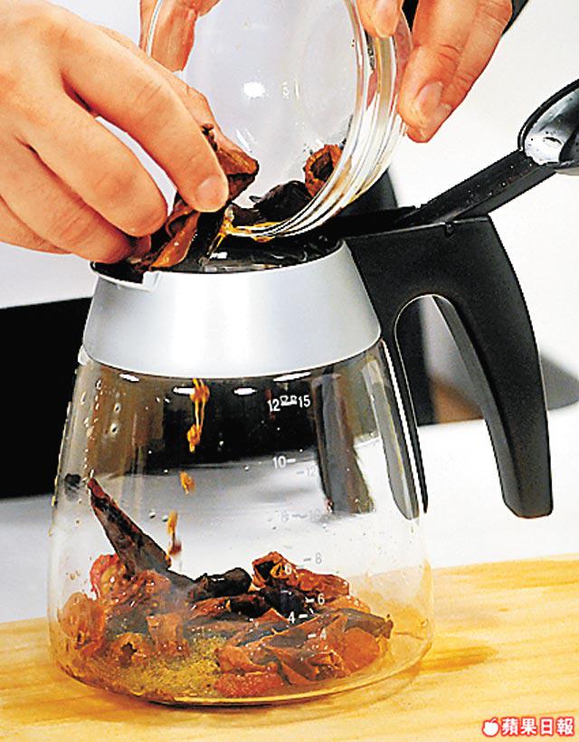 2.茶壺放入圓肉、山楂片、玄米茶、翠衣,加入滾水浸泡約8分鐘便可飲用。每壺茶可翻泡三次。