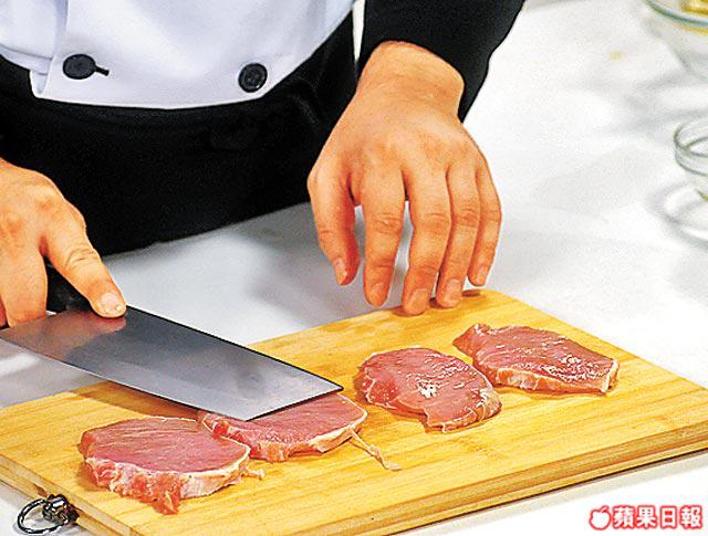 2.起鑊用中火煎香豬柳,每面約2分鐘,盛起後切成小件。