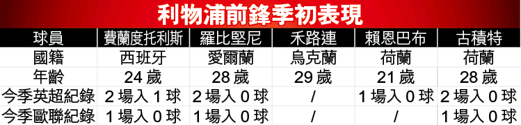至於賴恩巴布早前因代表荷蘭參加京奧,直至上周六對米杜士堡的英超才為紅軍上陣,並發揮「後備殺手」本色,後備上陣助球隊反勝2:1。其同胞古積特則與羅比堅尼及F托利斯一樣,出任右中場或右翼,表現尚可。
