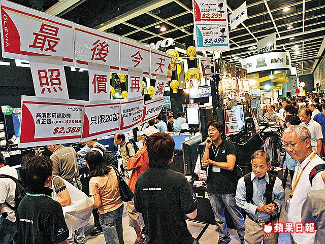 【本報訊】今年香港電腦通訊節開幕遇上颱風被迫腰斬,展期延長至昨日結束,反而更加丁財兩旺。入場人次突破52萬,營業額創下2.2億元新高。有市民在壓軸拍賣會用一元買得《電腦防護天書》,又以抵買價購得iPhone3G送給愛妻。 記者:林社炳