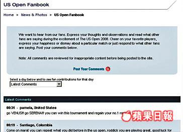 潮流興互動,網球亦不例外。未能親到美國觀賞今屆美網賽的球迷,大可在美網賽官方網的留言版留言,透過文字為自己支持的球手打氣,有興趣者可登上 http://www.usopen.org,頗有意義。