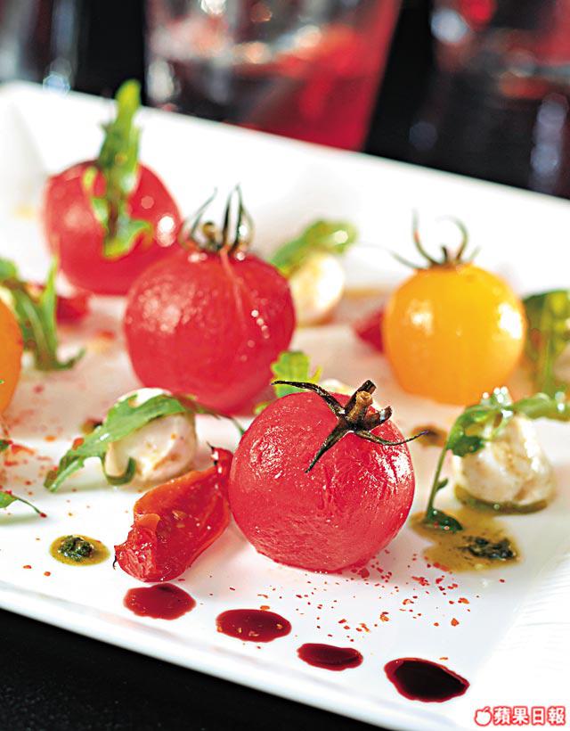 揀選荷蘭原隻番茄上碟,貪佢夠甜夠Juicy,剝皮後將番茄皮用80℃慢火爐焗脆,再攪爛磨粉,伴碟作裝飾。再將胡椒、橄欖油醃過的番茄同意大利水牛城芝士上碟。經Elvis耗盡心機設計擺設,賣相果然不同。
