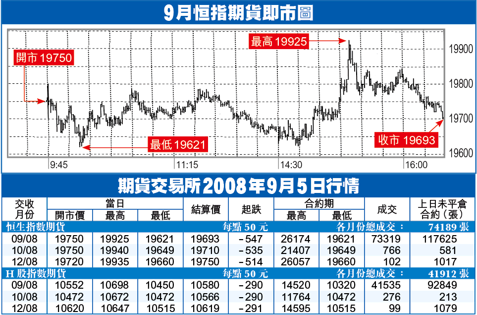 期指開市即下破20000關,裂口低開490點至19750,急跌至19621今年新低後稍為反彈,無力回補下跌裂口,以19693低收,急挫547點,大低水240點。