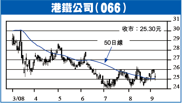 港鐵公司(066)昨收25.30元,跌1.55%,在大股之中,跌幅相對不大,算是偏強股份。股價下試50日線現支持,反彈至高於開市價收市,日線圖現陽燭陀螺,利好,以港鐵的穩定業務及前景,現水平應可吸引基金的長線買盤。