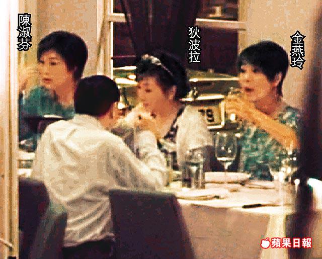 席間眾人齊齊亁杯,大家邊食邊傾,拉姑同金燕玲直情雞啄唔斷,後者兩杯到肚更顯豪情,講嘢手舞足蹈。同成班男友人平排坐嘅阿蘇,表現同身邊男伴無異,都係負責聽同食,甚少搭嘴,對女士們好有風度。