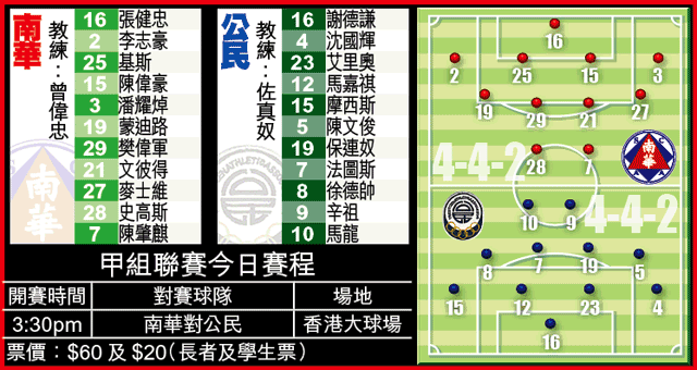 翻查往績,公民是上季雙料冠軍南華唯一未贏過的對手。衞冕的南華今日在大球場再遇公民,前者揚言可淨勝兩球,後者點出對手最怕硬淨的弱點。這場堪稱「瓷器撼缸瓦」的大戰,將為今季甲組聯賽揭開序幕。(無綫翡翠台今日3:30pm直播)