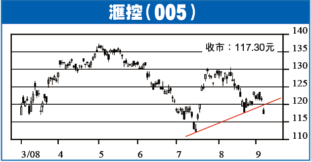 大跌浪進入高潮,大價股輪流被洗倉,滙控(005)昨日大成交一舉插穿120元,10日線支持即告失陷,股價更以117.30元最低位收市,並已跌穿由7月中低位112.20元建立的上升軌,走勢利淡,短線若再爆現裂口式下跌,恐怕連年內低位104元延伸而上的長期升軌也會不保,料低位在後頭,無謂急於撈貨,待跌至100元邊緣才考慮。