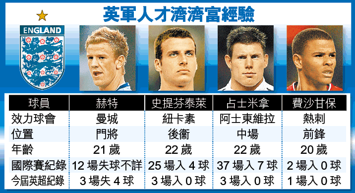 簡評:英U21代表隊人才濟濟,紐卡素後衞史提芬泰萊、熱刺中場侯度史東及阿士東維拉中場占士米拿在國際賽上陣25場或以上,而且同於英超打滾多年,故經驗及實力均毋庸置疑。至於負責把守富豪球會曼城之大門的赫特、韋斯咸中場麥克盧保,以及由曼聯被借至熱刺的費沙甘保,同被認為是英格蘭的明日之星。