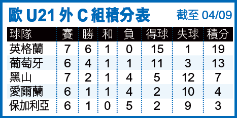 先談歐U21外C組形勢,英格蘭7戰6勝1和得19分排榜首,今役只要和波亦能首名出線,故換來可觀的1.8倍W賠率;葡萄牙則6戰4勝1和1負得13分居次,雖有少賽1場優勢,但細心留意其實爭首名難度甚大。