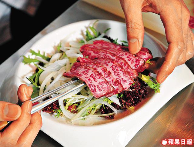 綾牛西冷200克、紅葉20克、狗牙20克、牛油菜20克、洋葱絲20克