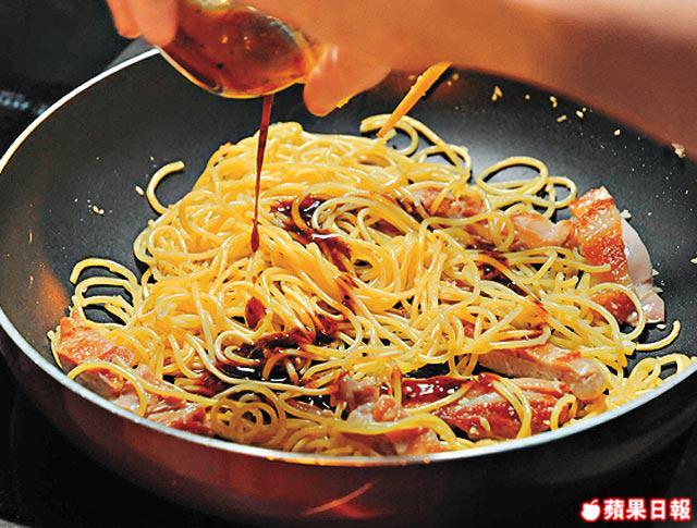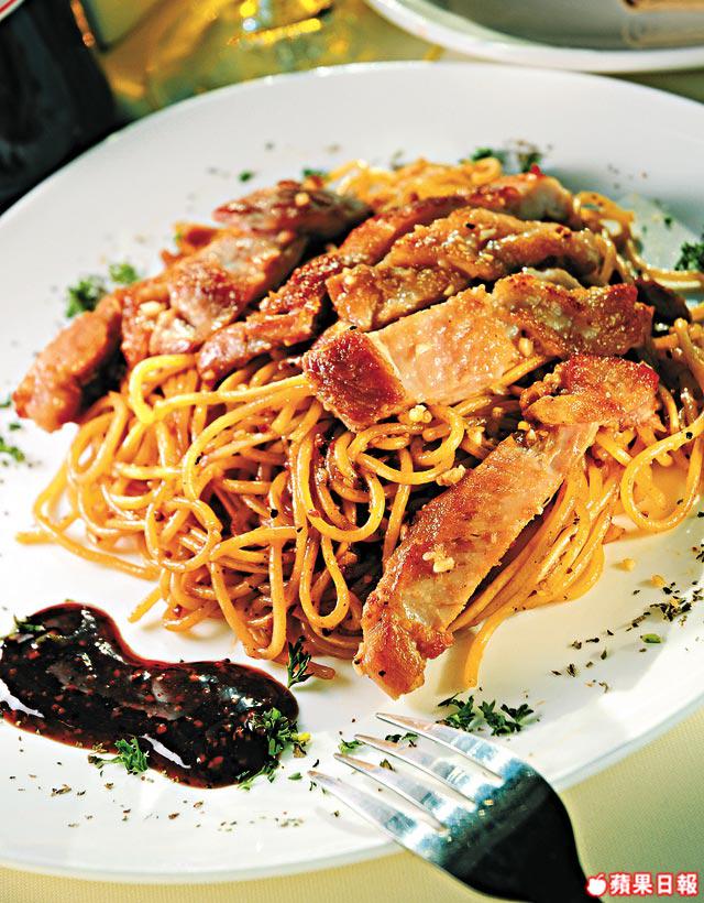 2.意粉放滾水煮至六成熟。起鑊爆香蒜茸,下意粉兜炒一陣,下雞扒略炒,加黑椒汁拌勻便可。