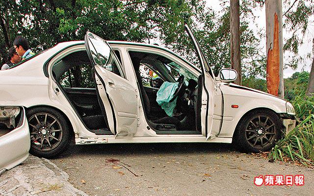 【本報訊】一輛私家車昨日駛經落馬洲新田公路,司機發現汽車的水箱水滾,於是將車駛上路邊的警車專用「烽火台」,其間疑因車速太快,失事撼向大樹車頭損毀;其中一名男乘客頭部撼向車窗邊的柱位,當場頭破血流危殆,事後與另外三名輕傷乘客一併送院。記者:陳天華、江寶龍