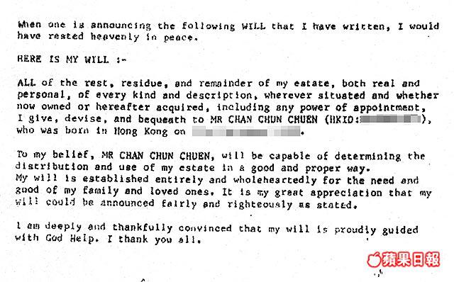 我深信陳振聰先生可妥善及適當地分配及使用我的遺產。我是全心全意為家人及我所愛的人的需要及福祉而訂立遺囑。對於我的遺囑能如前述公平公正地公布,我深表感激。
