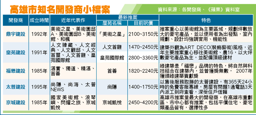 皇苑、鼎宇、福懋、太普、京城都是高雄市最具知名度的大型開發商,其中,福懋、京城是經營至今超過20年的老字號品牌;鼎宇、皇苑則是近年集中火力在最熱門的美術館特區推豪宅案,成為高雄市2大豪宅品牌;太普則因完善的售後服務,逐漸躋身新興名牌開發商之列。