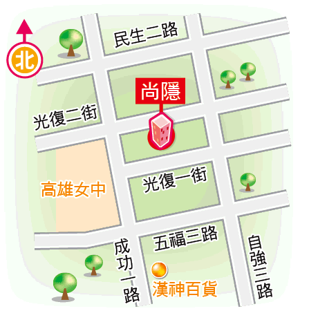 太普開發商「尚隱」位高雄市中心自強二路、光復路口,鄰近大立百貨、新堀江商圈,周邊有中央森林公園、城市光廊等休閒景點,步行到捷運中央公園站約10分鐘,訴求生活機能佳。