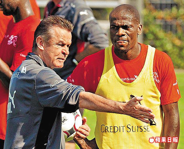 前拜仁慕尼黑教練希斯菲特(左),首領瑞士在正式比賽出戰,在場邊向球員督師。美聯社