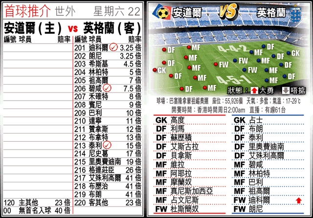 沒有謝拉特,也沒有奧雲,但英格蘭亦冇有怕,事關周六他們在2010年南非世界盃歐洲區外圍賽第6組分組賽對手,只不過是魚腩部隊安道爾,料可旗開得勝,捧他們在中立場西班牙巴塞隆拿蒙祖錫奧運球場,再開3:0波膽。