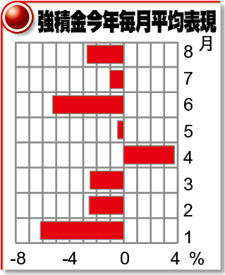 基金研究機構理柏的資料顯示,強積金今年首8個月表現,除4月份錄得3.75%正回報外,其餘7個月均錄得虧損,8月份平均再跌2.71%,首8個月累積跌幅達12%。各類資產類別中,上月只有貨幣市場基金及保證基金力保不失,分別上升0.09%及0.03%,即使是防守力較強的債券基金,亦平均下跌0.72%。