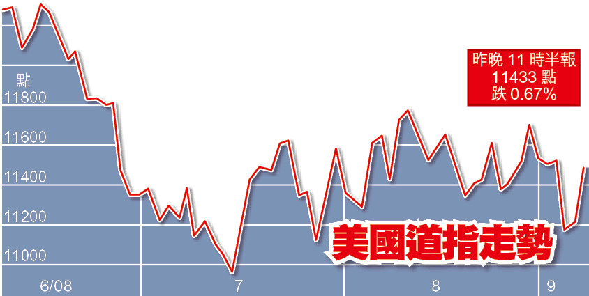 開市後兩小時(本港時間昨晚11時半),道指跌77點,報11433點;納斯達克綜合指數挫15.27點,報2254.49點。《泰晤士報》指英國政府可能效法美國出招救樓市,英、法、德三大股市昨早段上揚,但尾段跟隨美股倒跌,跌0.6%至1.2%。亞太區股市昨回吐,MSCI亞太指數於尾市跌2.1%至118.85。日本日經指數昨跌1.8%,收報12400點。