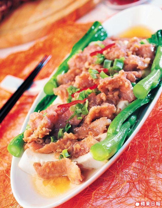 百福滑豆腐1盒、豬面青肉120克(切片)、菜心4條、亁葱片3克、薑蒜茸5克
