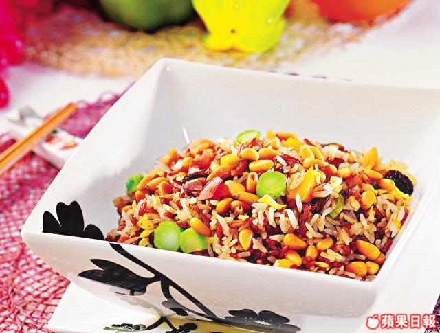 3.加入叉燒粒、生果菜粒,最後撒上松子仁上碟。
