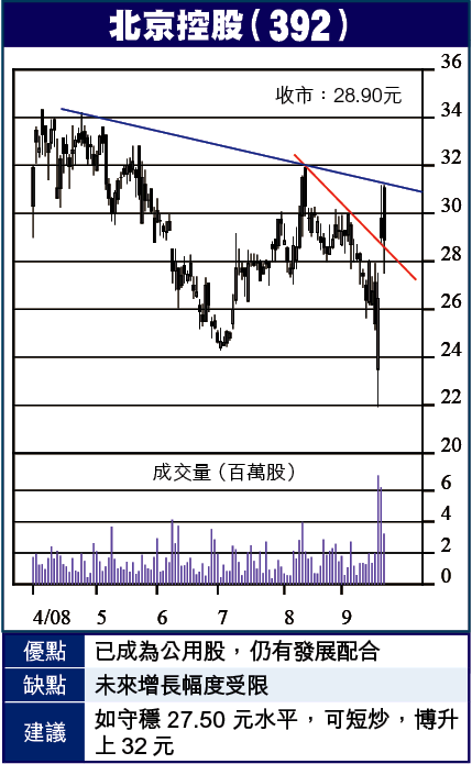 北控現價28.90元,預期PE15.5倍,息率2.3厘,在穩定中而有增長動力,前景看好,而波動之後,股價待鞏固,暫以短線為主,中長線再作觀察。