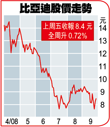 彭博資訊的資料顯示,比亞廸於上周五的08年市盈率為9.5倍,今年盈利預測15.78億元人民幣,按年跌2%。上月底公佈的中期純利跌7%至5.96億元人民幣。比亞廸於去年10月股市高峯期,曾創下每股20.45元的巔峯,但之後持續回落,至上周五收報8.4元,累計跌幅達59%,返回去年初水平。