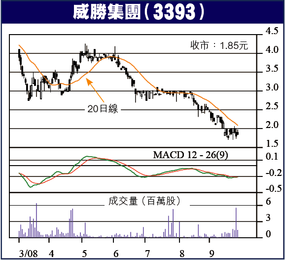 威勝手頭定單理想,並有信心今年可達標。08年全年,估計盈利達2.65億元,每股盈利32分(約36港仙),派息12港仙,預測PE5倍,息率逾6厘,屬可趁低吸的穩健工業股,中線目標價2.50元。