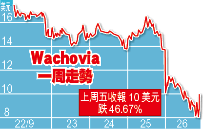 【本報綜合報道】備受按揭壞賬困擾的美國第四大銀行美聯(Wachovia),據報正積極尋求合併夥伴,對象包括美國花旗集團、富國銀行(WellsFargo)和西班牙桑坦德銀行(BancoSantander)等。不過市場擔心,潛在買家可能等待美聯被政府接管後才提出收購,加上美聯的債務違約風險創新高,拖累美聯股價上周五暴挫27%,全周累計挫近47%。