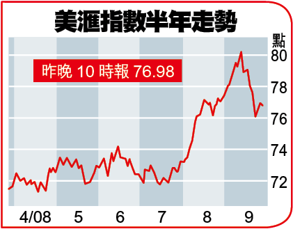其他數據如耐用品定單大跌4.5%,反映美國國民對一些大宗商品的消費趨於審慎,佔GDP逾七成的內需轉弱,美國經濟前景自然不容樂觀。至於新申領失業金的人口急升至49.3萬,雖說是受颶風影響,但逼近50萬心理關口,始終反映美國經濟距離衰退越來越接近,美元又何來大升的條件?