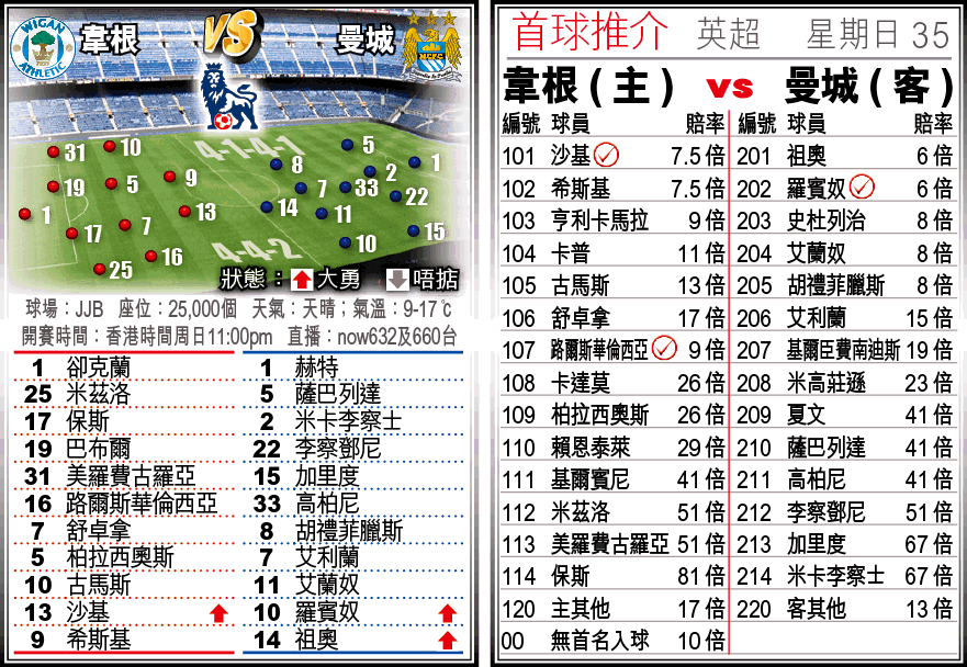 曼城毫無疑問是星光熠熠,但始終是新埋班,需時磨合,故周日在英超作客相當硬淨的韋根,要讓平手/半球宜取韋根下盤。(球賽編號:星期日35;now632及660台今日11:00pm直播)